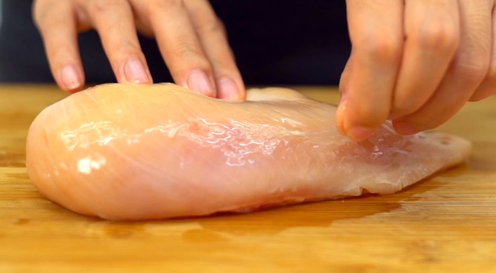准备一块鸡胸肉,将上面的脆骨,黄油,和膜清理干净,这样吃起来口感更加好